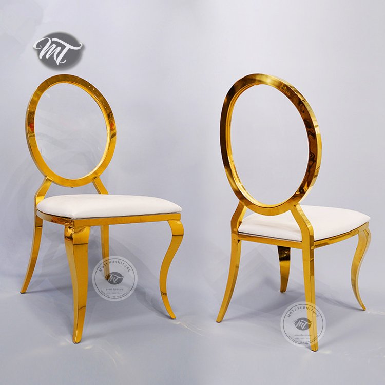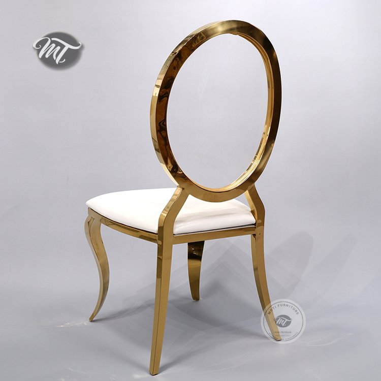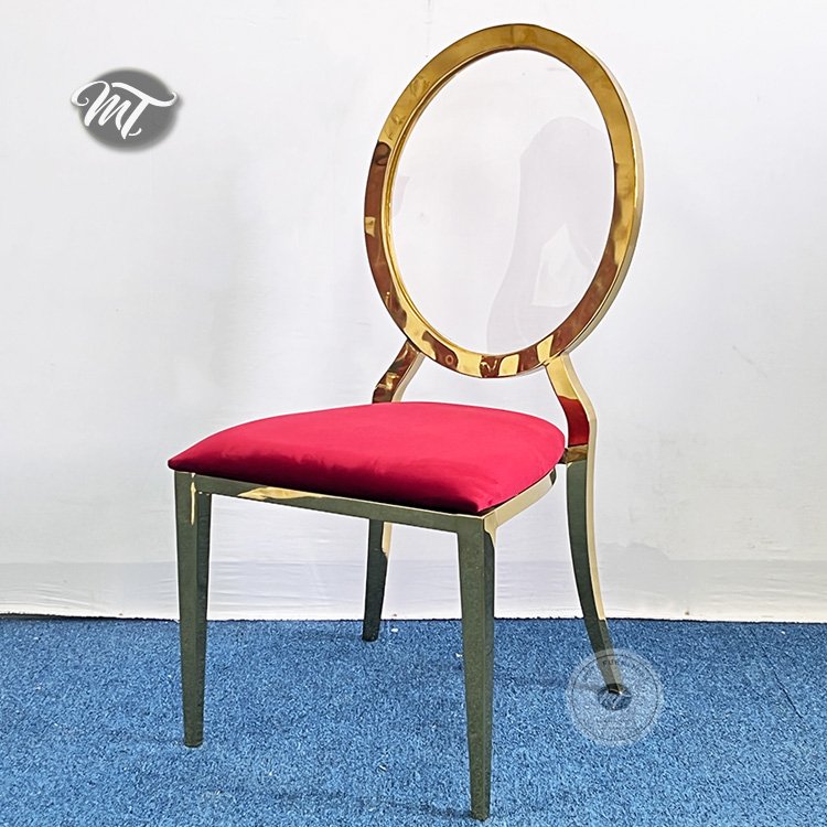 Elegant and durable wedding stainless steel chair with round acrylic back perfect for luxury events. Rust-resistant, and ideal for indoor or outdoor celebrations.